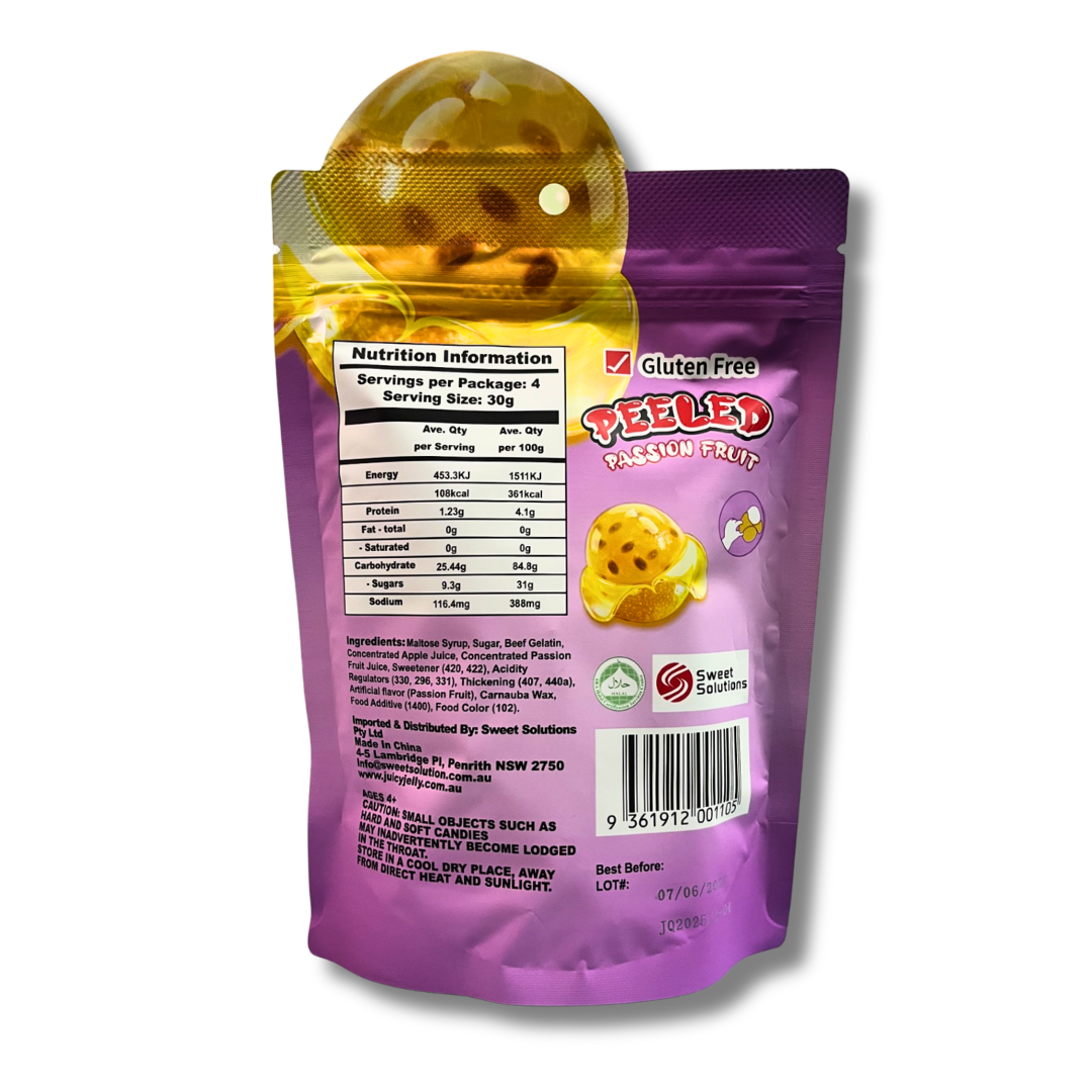 Experience the fun of Peelable Gummies with our delicious Passionfruit Gummy Candy! A hit with kids, TikTokers, and anyone who loves a good fruity lolly fix. Each gummy is designed to look like a Passionfruit, complete with a soft outer “peel” layer that you can gently remove to reveal the juicy, chewy gummy inside.