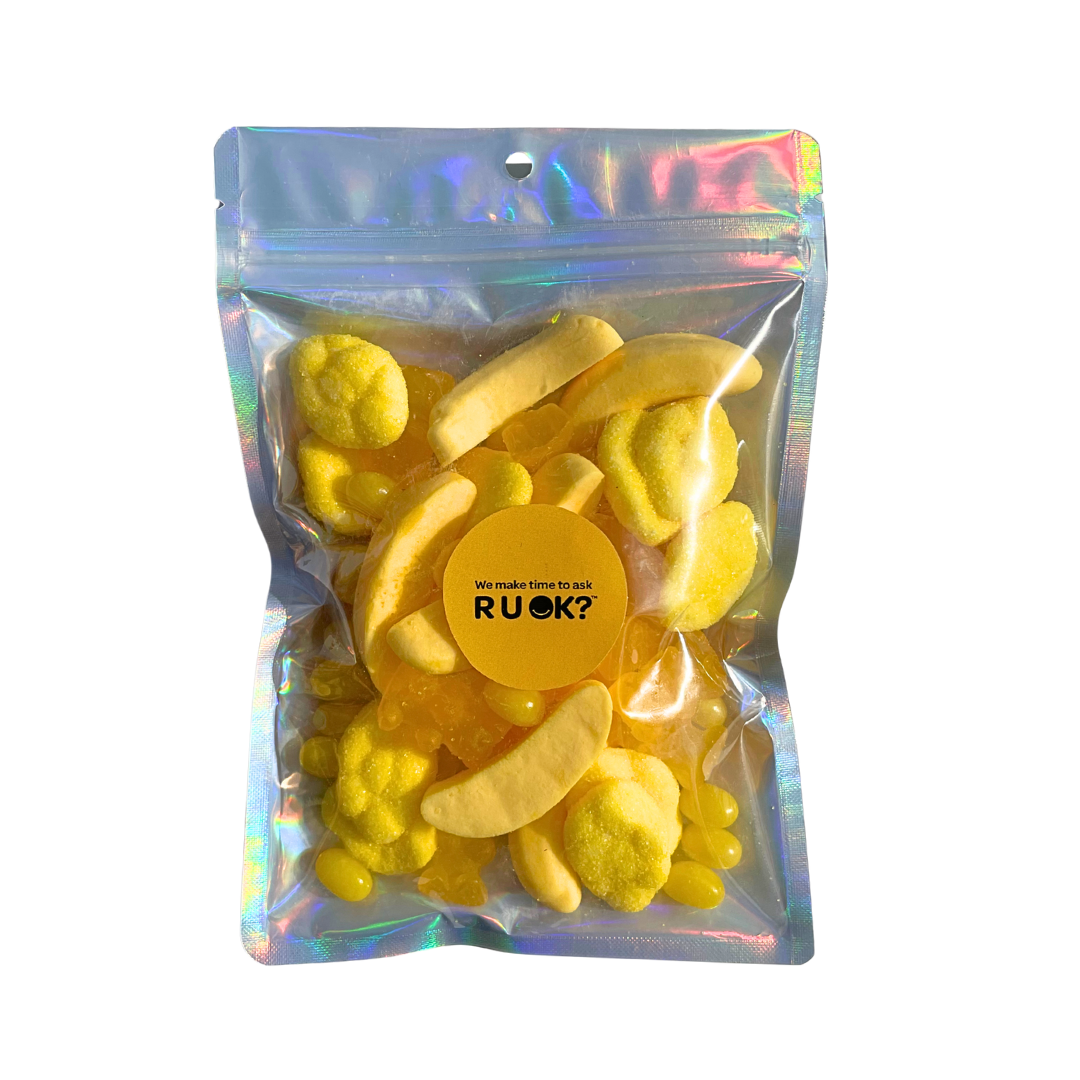 Finished with an official R U OK? sticker, it’s a sweet and thoughtful way to show support at work, in care packs, or at community events. Because sometimes, a handful of yellow treats is all it takes to start a conversation.