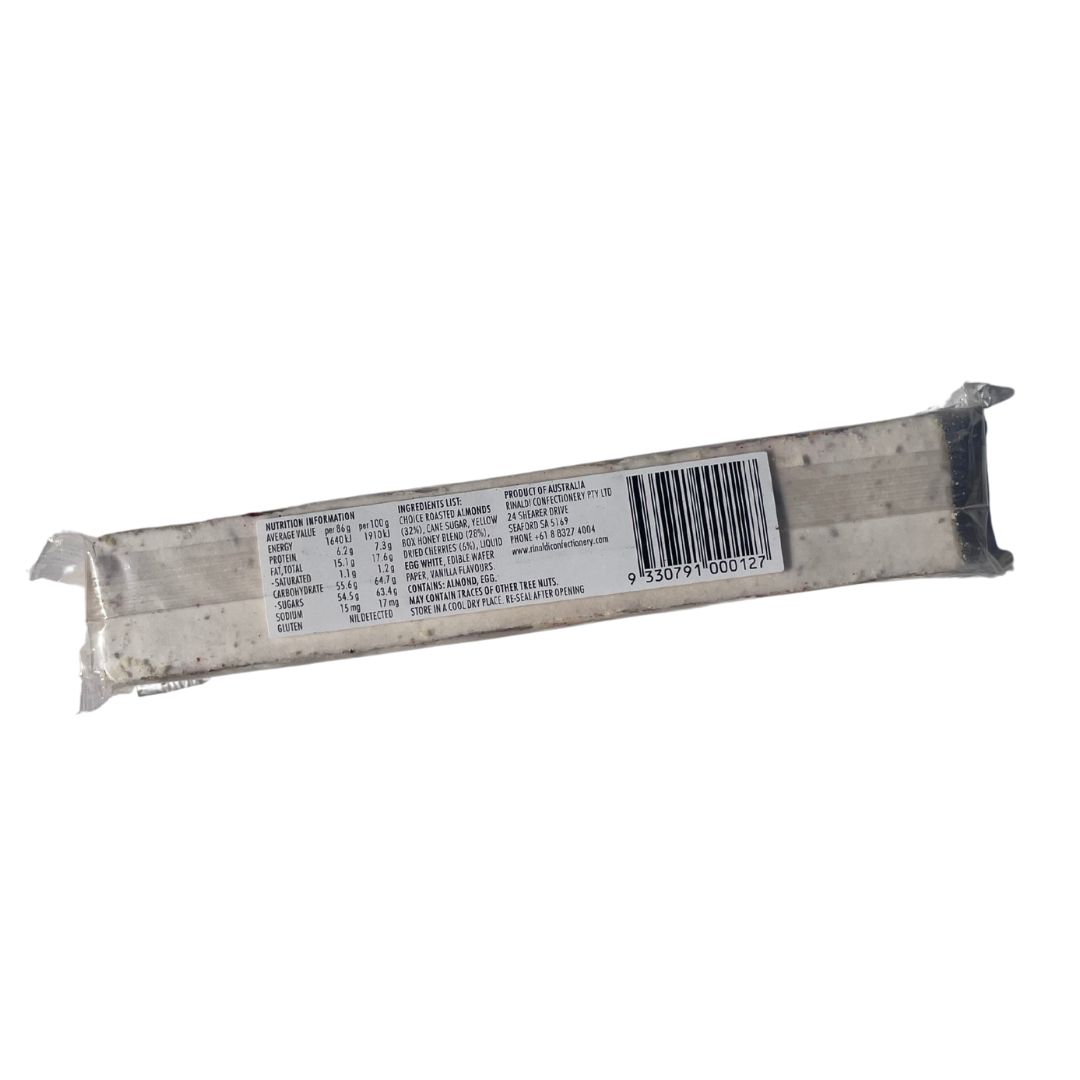 Indulge in the artisan taste of the Rinaldi Soft Nougat Bar, crafted in Australia with premium almonds (24%), golden honey (5%), and zesty candied orange peel (5%). This gluten-free nougat delivers the perfect balance of soft, chewy texture and nutty crunch, with a refreshing citrus twist. Each bar is made using traditional confectionery methods, blending glucose syrup, sugar, and egg whites to create a light and airy nougat, finished with delicate wafer paper for a classic touch.