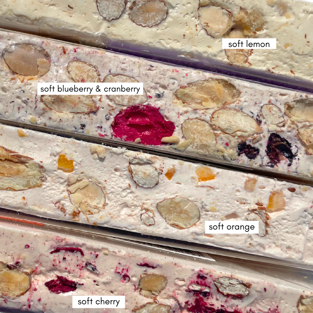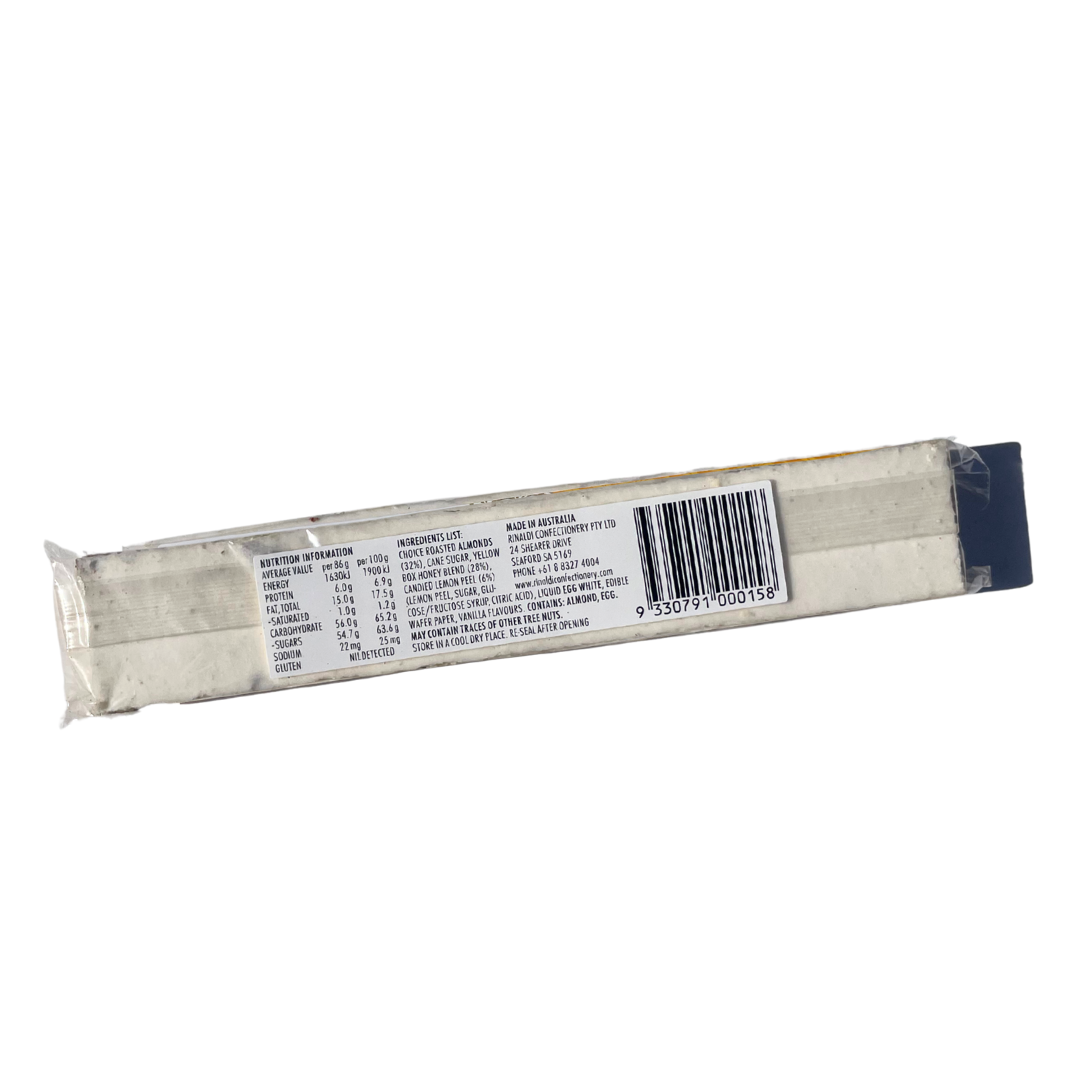 Delight in the refreshing flavors of the Rinaldi Soft Nougat Bar – Lemon, Almond & Orange Blossom, handmade in Australia with care and tradition. This soft, chewy nougat features 24% crunchy almonds, balanced with the zesty sweetness of 5% candied lemon peel and the delicate fragrance of orange blossom water (0.1%), all enriched with golden honey (5%).