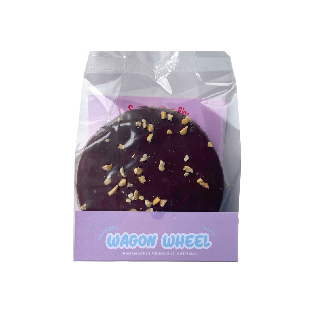 A delicious twist on a classic favourite! Sweet Darln's Limited Edition Snickers Wagon Wheels are made with their signature fluffy marshmallow, layered with gooey caramel, crunchy roasted peanuts, and buttery biscuits – all coated in rich chocolate and topped with even more peanuts.